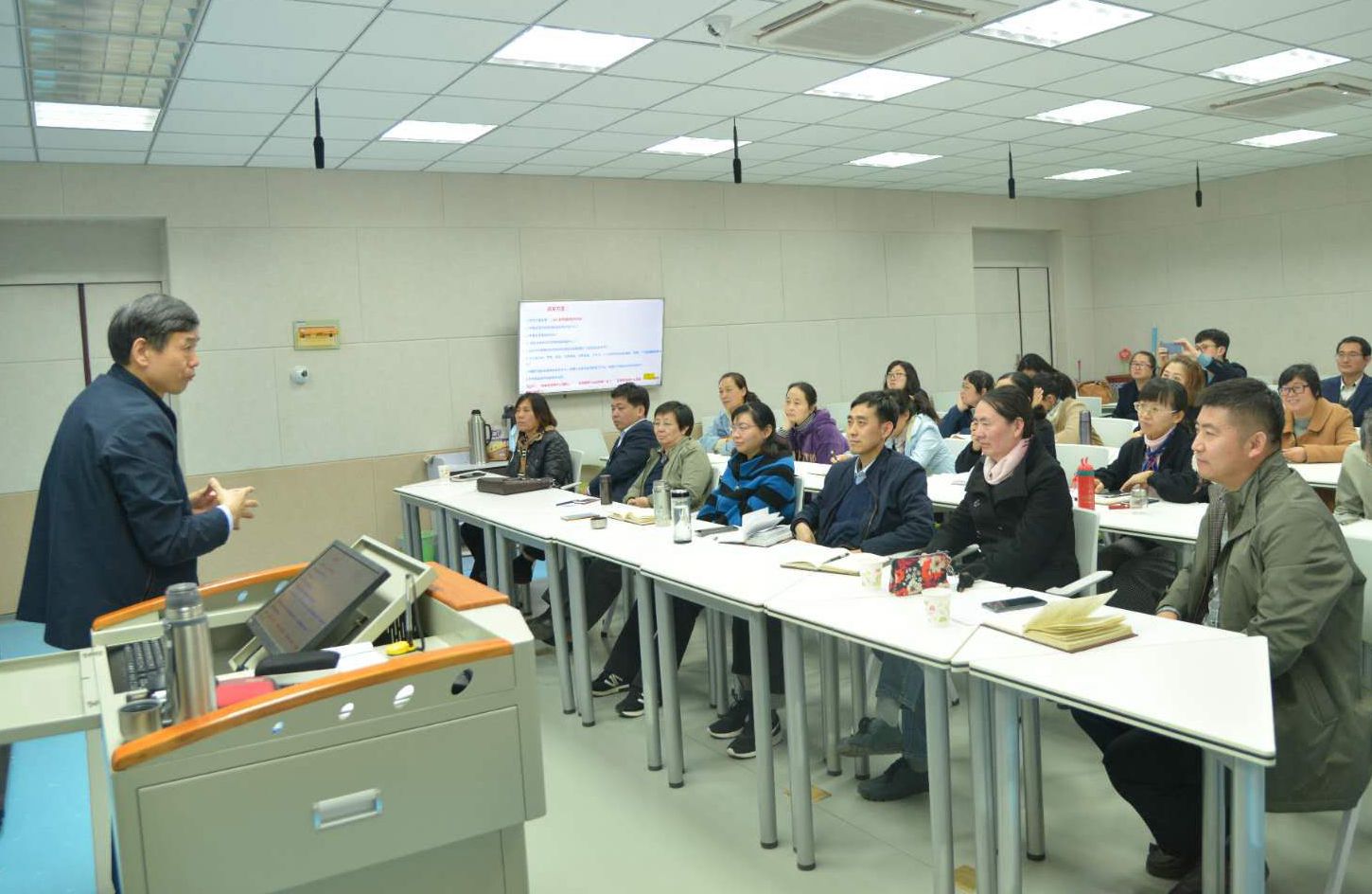 报告会上,李朋忠教授讲授了一堂思政示范课,以其深厚的理论功底、扎实的教学基本功、富有激情的语言表达展示了思政课应有的理论深度和情感温度,以及触动学生心灵、提升学生境界、引领学生发展的针对性和实效性。李朋忠教授结合自己多年来的思政课教学经验,讲述了“如何做一个好老师”的思考,阐发了教学工作必须把握好的“八个环节”,以及如何处理好教材体系与教学体系、教材主导与学生主体、课堂主阵地与课下辅阵地等“六大关系”。李朋忠强调,思政课教师要发挥“会讲故事”“讲好故事”的精神感召力,弘扬主旋律、传播正能量,引导学生追求真善美。他建议青年思政课教师多读书、读经典,多做研究、筑实功底,尊重学生、呵护学生理想情怀,使个人的教学超越“知识传授”的层面,上升为“方法指导”和“提高境界”的更高层面,尽快形成自己的教学个性和教学风格。