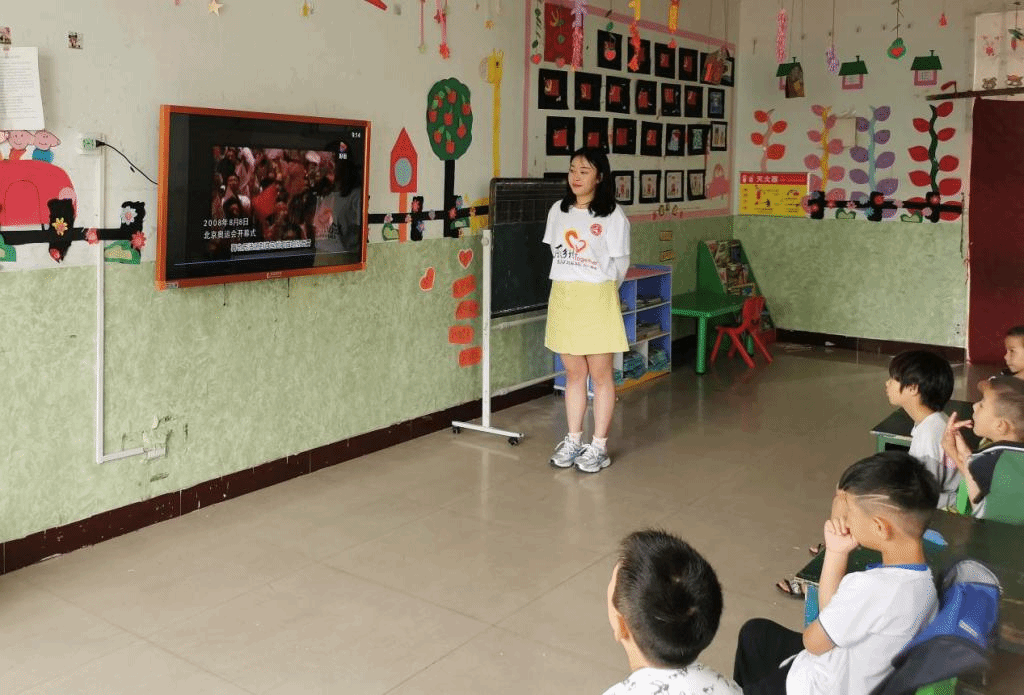 “五星红旗迎风飘扬……”,随着优美动人的旋律,志愿者马晓琛为小朋友们教唱《歌唱祖国》的音乐课开始了,小朋友们顿时瞪大了眼睛,现场氛围十分热烈,有的小朋友大声的跟唱,有的小朋友和着音乐的节拍晃动身体。志愿者将前一天小朋友们在绘画课上的成果照片放在了大屏幕上,并将绘画课上五星红旗的星星代表什么为问题导入,在将红色知识串联的同时,凸显讲课的主题,融入红色文化,为幼儿树立正确的世界观、人生观价值观奠定基础。