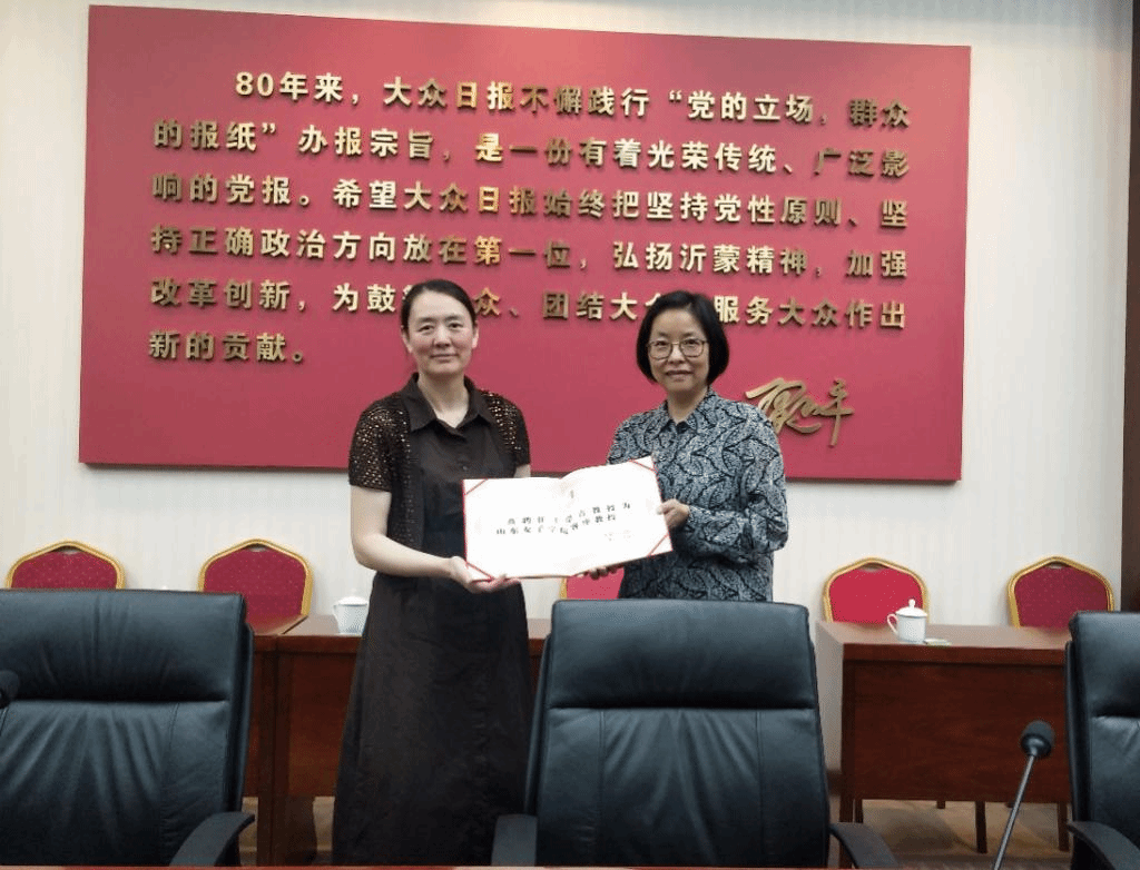 参观结束后,双方在大众日报社会议室举行签约仪式,石荣菊向于岸青颁发了“山东女子学院客座教授”聘书。