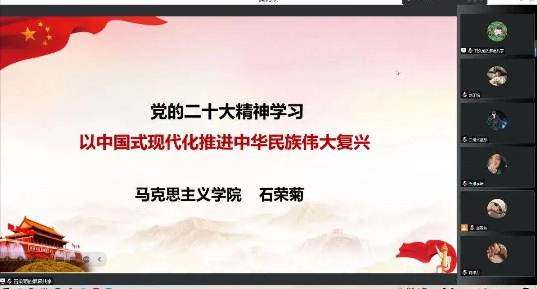 石荣菊紧扣党的二十大主题,结合习近平总书记提出的“五个牢牢把握”,分析了党的二十大报告内容的逻辑框架,使同学们更好地掌握二十大报告内容。她由浅入深、逐层深入的讲述中国式现代化的探索过程、取得成效和与发达国家之间的差距,用丰富的案例阐释中国式现代化的中国特色、本质要求,以及党的二十大报告对未来的五年环境判断和应对原则。她勉励同学们,要肩负历史使命,勇担时代责任,既要仰望星空,又要脚踏实地;建成社会主义现代化强国,实现中华民族伟大复兴,是一场接力跑,我们要一棒接着一棒跑下去,每一代人都要为下一代人跑出一个好成绩!