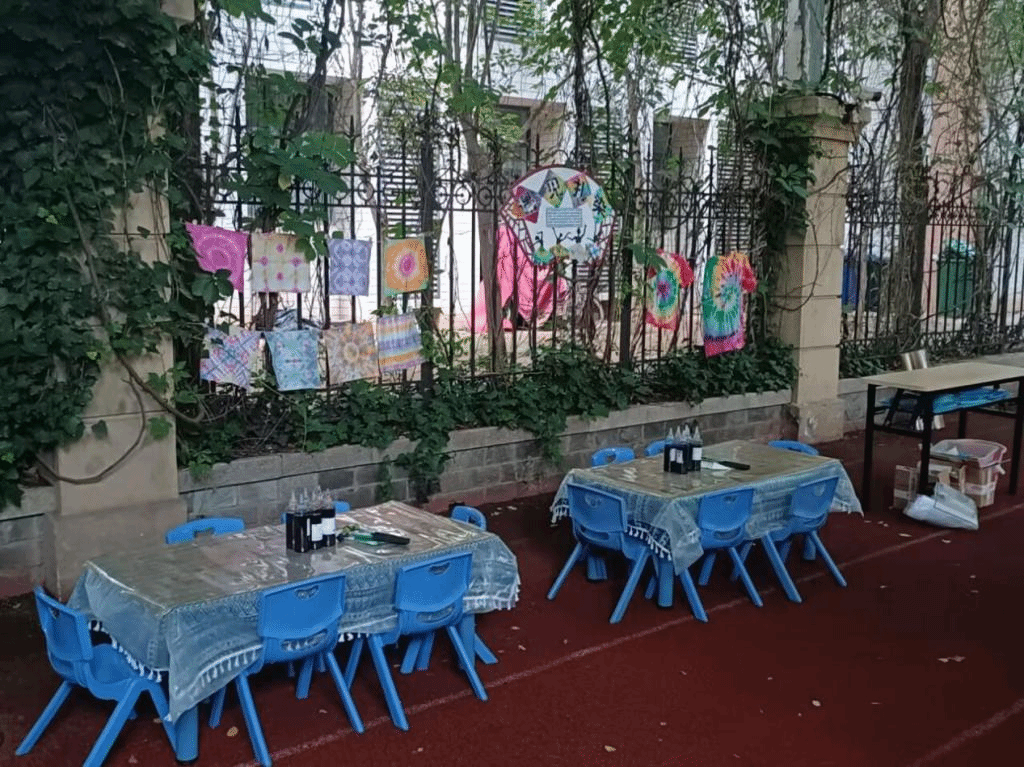 为了让小朋友们对传统扎染工艺有更丰富的认识与体验,度过一个愉快而有意义的儿童节,6月1日上午,传统文化学会部分成员应邀来到常春藤附属幼儿园非遗文化一条街,推出扎染摊位,与小朋友共同开展扎染活动。