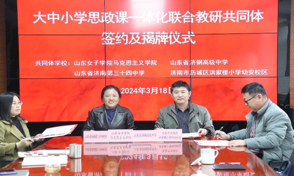 为深入贯彻落实立德树人根本任务,推进大中小学思政课一体化建设,3月18日上午,马克思主义学院在山东省济南第三十四中学参加“大中小学思政课一体化联合教研共同体”签约揭牌仪式。山东女子学院马克思主义学院院长姚树欣、山东省济钢高级中学副校长王文涛、济南市第三十四中学领导班子、历城区洪家楼小学幼安校区副校长季英华及高中部邢小冬老师、初中部王倩老师、小学闫玉鹏老师等思政教师参加了此次活动。