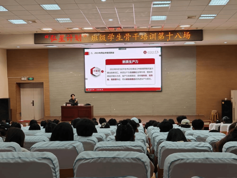 3月21日下午,学生工作处于图书馆一楼报告厅举办了第十八场“弘星计划”班级学生骨干培训,红心讲师团成员、我院思政课教师焦路尧以《两会历史沿革与2024年全国两会解读》为题,为全校非毕业班班长做专题培训。