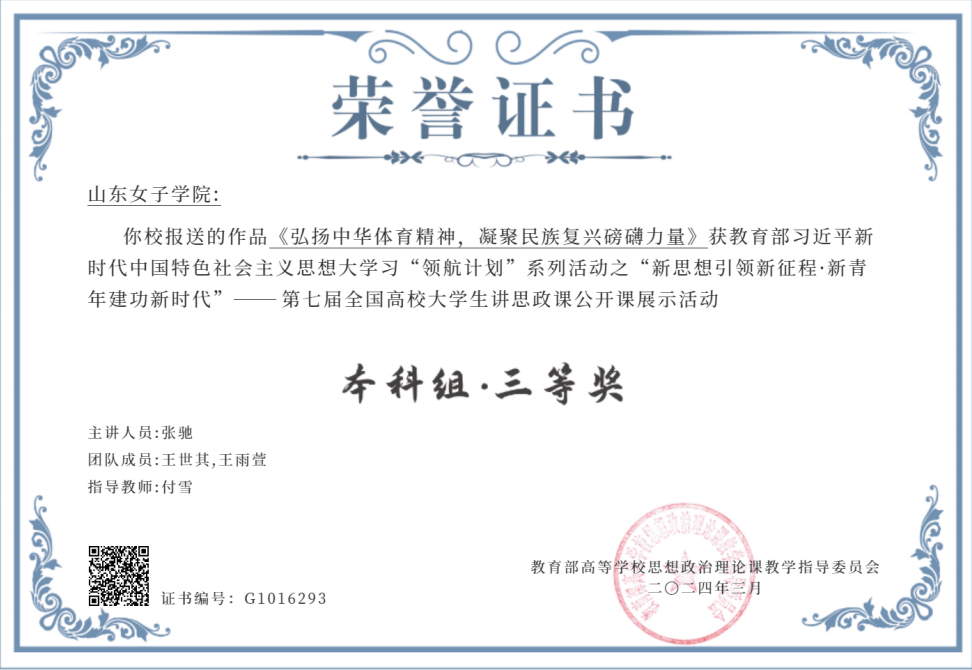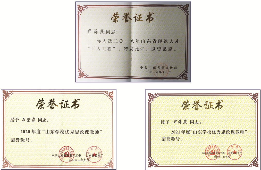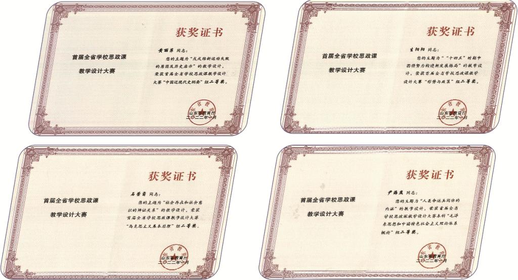 七年来,学院获得山东省思政课金课立项1门,省级教改立项1项,省思政课优秀教学设计二等奖4项,省思政课萌新磨课二等奖1项,省级青教赛优秀奖1项,省课程联盟优秀教学案例三等奖1项,指导大学生讲思政课比赛,获得教育部三等奖1项,省级三等奖1项,获得校级金课3门,其他奖项多项,思政课教学水平实现新跨越。