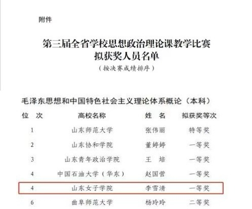 近日,山东省教育厅公布《第三届全省学校思想政治理论课教学比赛获奖人员名单》,马克思主义学院教师李雪清荣获《毛泽东思想和中国特色社会主义理论体系概论》组一等奖, 充分展示了我校思政课教师的课堂教学水平,实现了我校在该项赛事上零的突破。