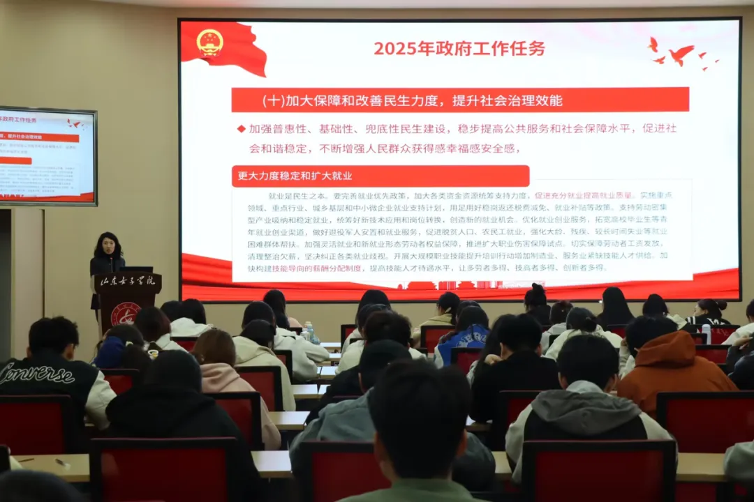 本次讲座围绕2025年两会政府工作报告的重点内容展开了深入讲解。孙继鲁首先全面剖析了中国政府工作报告的性质、形成过程、制定背景等内容,并强调了大学生认真学习政府工作报告的重要意义。随后,孙继鲁重点解读了2025年政府工作报告的核心要义,并通过与2024年报告的对比,深入分析了报告背后的政策导向与深层次含义,使同学们更好地理解国家发展动向和政府工作重点,直观感受马克思主义中国化时代化最新成果的实践伟力,为新时代大学生锚定历史方位、增强战略定力提供了认知坐标,有助于青年学生骨干增强对中国特色社会主义道路的政治认同、思想认同、理论认同和情感认同,培育了青年一代的政治自觉与使命担当。