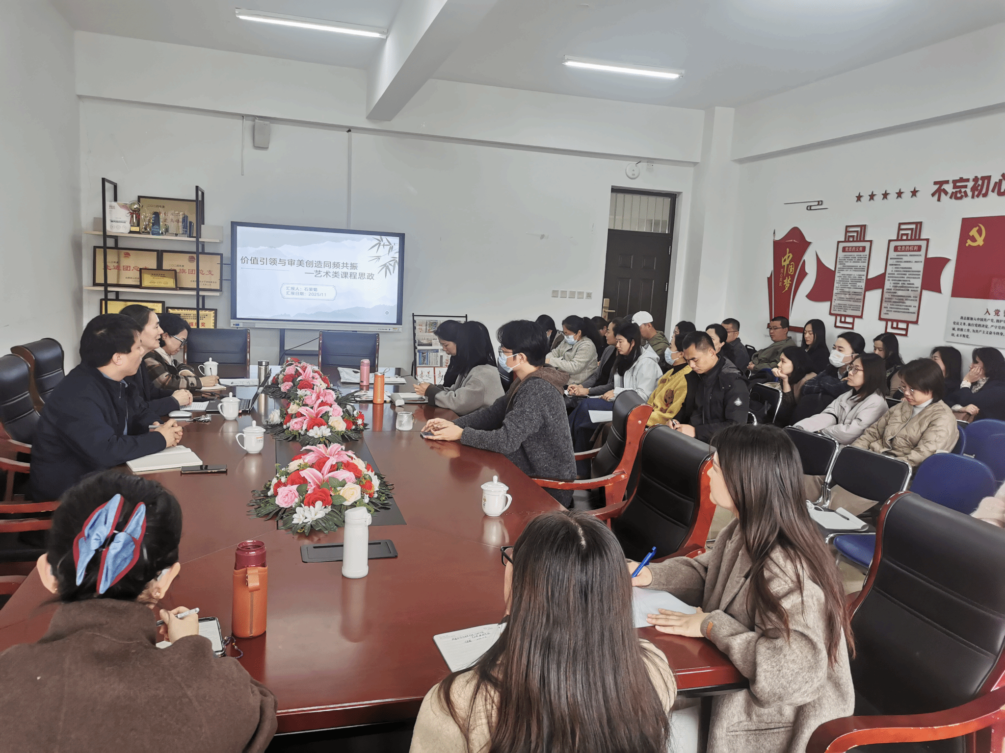 为深入贯彻落实《高等学校课程思政建设指导纲要》精神,推动思政教育与专业教学协同育人,11月6日下午,马克思主义学院副院长石荣菊受邀至艺术设计学院,开展题为《价值引领与审美创造同频共振——艺术类课程思政建设路径》的专题培训。艺术设计学院党委书记颜涛、副院长(主持工作)赵月、副院长赵崇立及全体教师,马克思主义学院思政教师闫滨、徐梅霞、李晶晶共同参与。本次活动由颜涛主持。