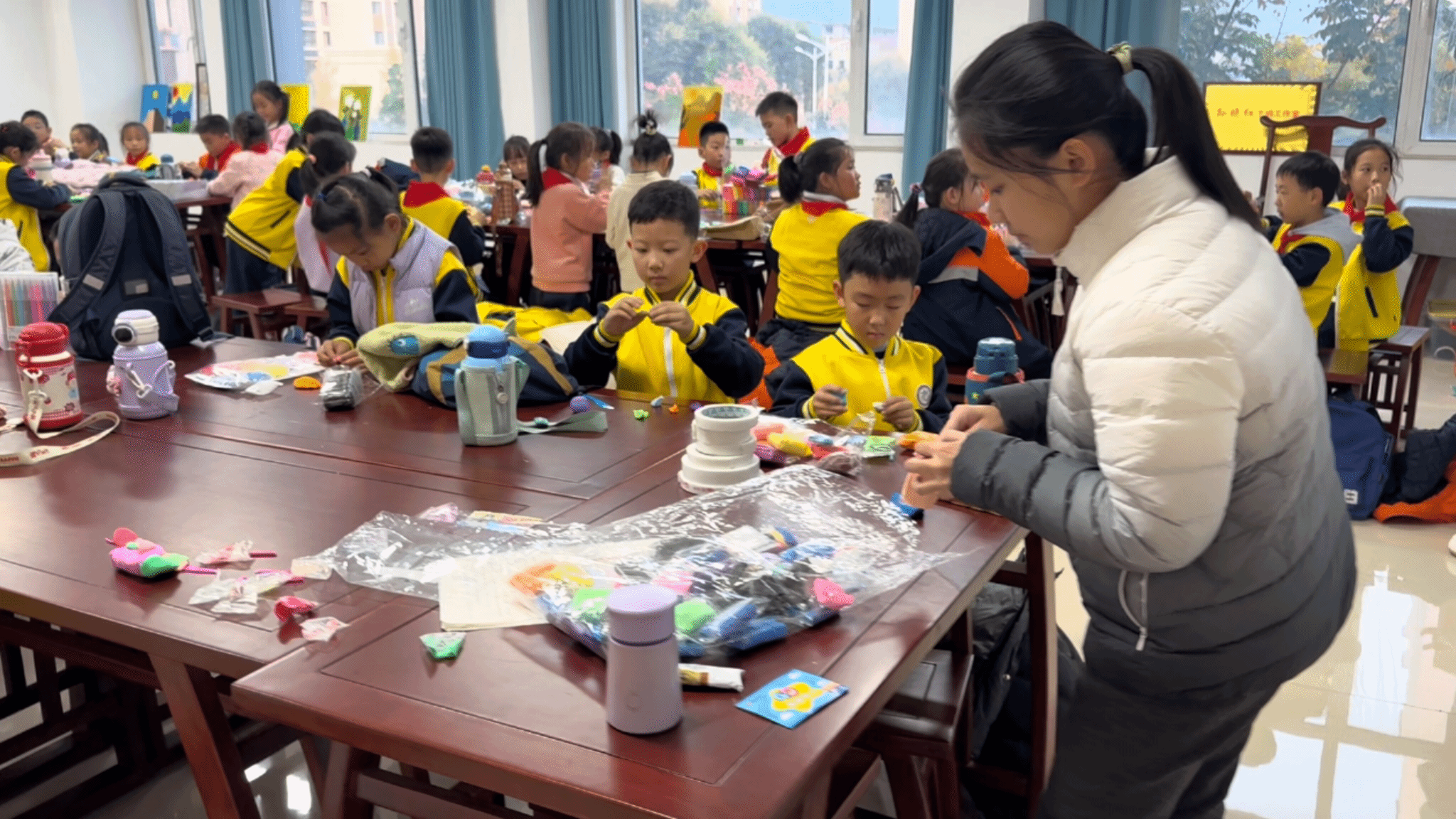 互动中,学生们专注创作、不时交流想法,课堂里既有着手工实践的专注,也透着对传统文化的好奇。活动尾声,学生们举着自己完成的彩泥作品,与志愿者分享创作的小灵感。