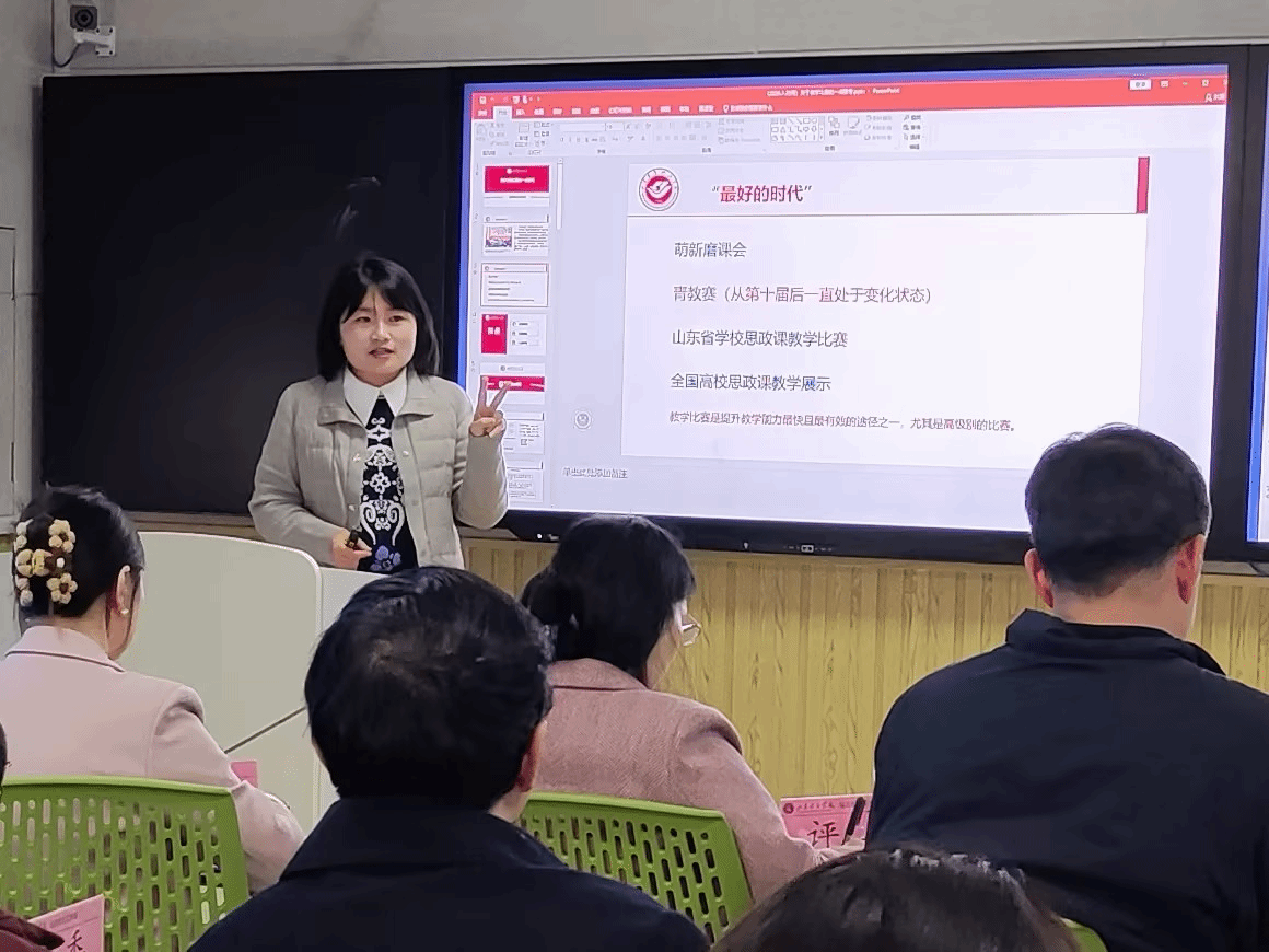 随后,全国高校思政课教学展示活动二等奖、山东省高校青年教师教学比赛一等奖获得者,山东青年政治学院岳倩老师结合自身参加省青教赛及全国思政课教学比赛的丰富经验,围绕备赛心路、教学设计精髓、课堂呈现技巧及成果转化应用等方面作了毫无保留的精彩分享,为在场教师提供了极具价值的参考与启发。