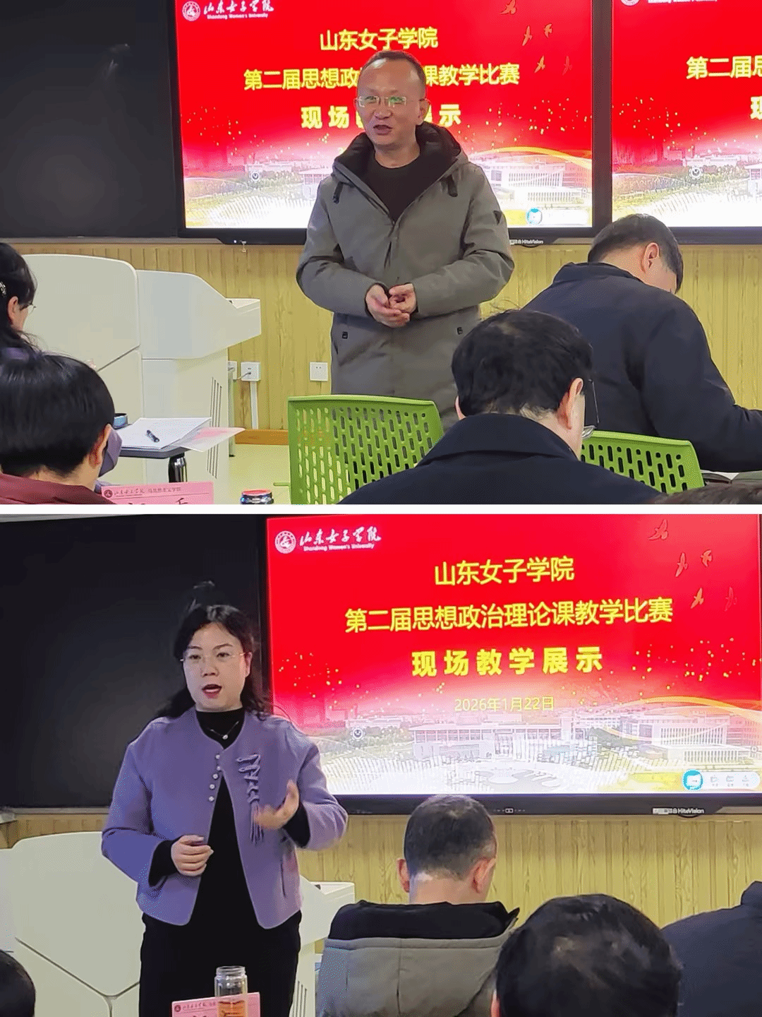 1月22日,学校第二届思想政治理论课教学比赛现场教学展示于求真楼403智慧教室举办。本次比赛特邀两名大学生代表担任学生评委,充分体现了“以学生为中心”的教学理念。学校教学质量监控与评估处、教务处相关领导参加,马克思主义学院全体教师到场观摩学习。