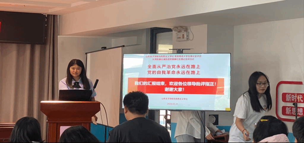 党纪学习教育是中国共产党加强纪律建设、推动全面从严治党向纵深发展的重要举措。马克思主义学社青言青语大学生理论宣讲团的同学们结合马克思主义学社日常理论学习活动和自身学习实践,简洁清晰地解读了《中国共产党纪律处分条例》,宣讲聚焦习近平总书记在山东考察时做出的加强党纪学习教育的重要讲话精神,为学校周边两个社区党员的理论学习活动奉献了精彩的理论宣讲,针对《中国共产党纪律处分条例》的具体条例的解读,引发了社区党员的热烈讨论。